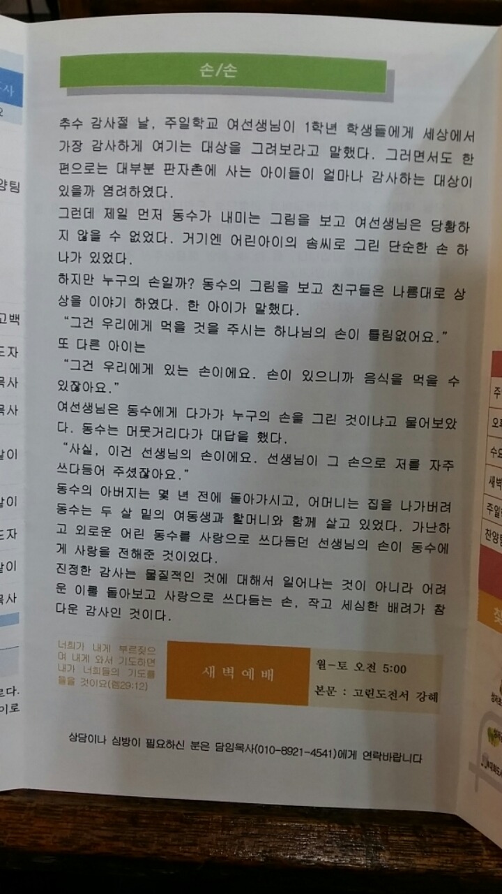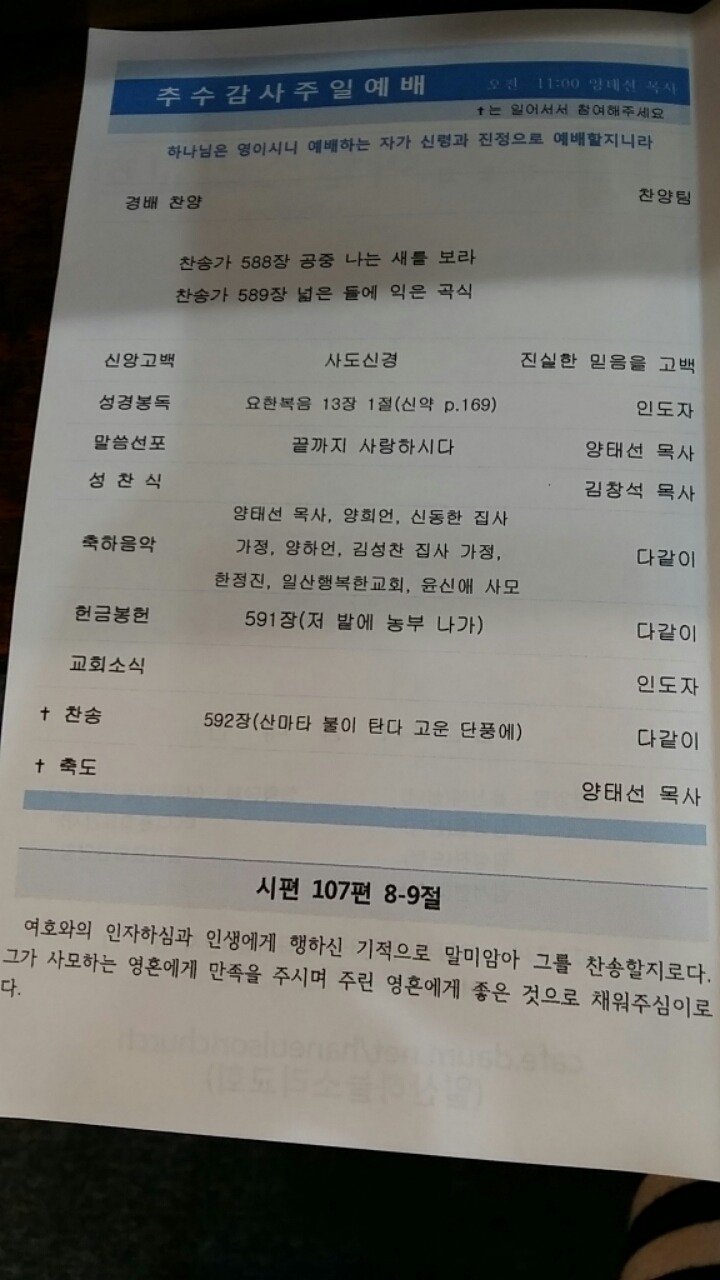 2015.11.15.추수감사주일 연합예배 작성자수다걸|작성시간15.11.15|조회수19 목록 댓글 0 글자크기 작게가 글자크기 크게가 행복한&하늘소리교회 연합 추수감사주일예배양태선 목사님 설교성찬식;김창석목사님 다음검색 현재 게시글 추가 기능 열기 북마크 공유하기 신고 센터로 신고 댓글 댓글 0 댓글쓰기 답글쓰기 댓글 리스트