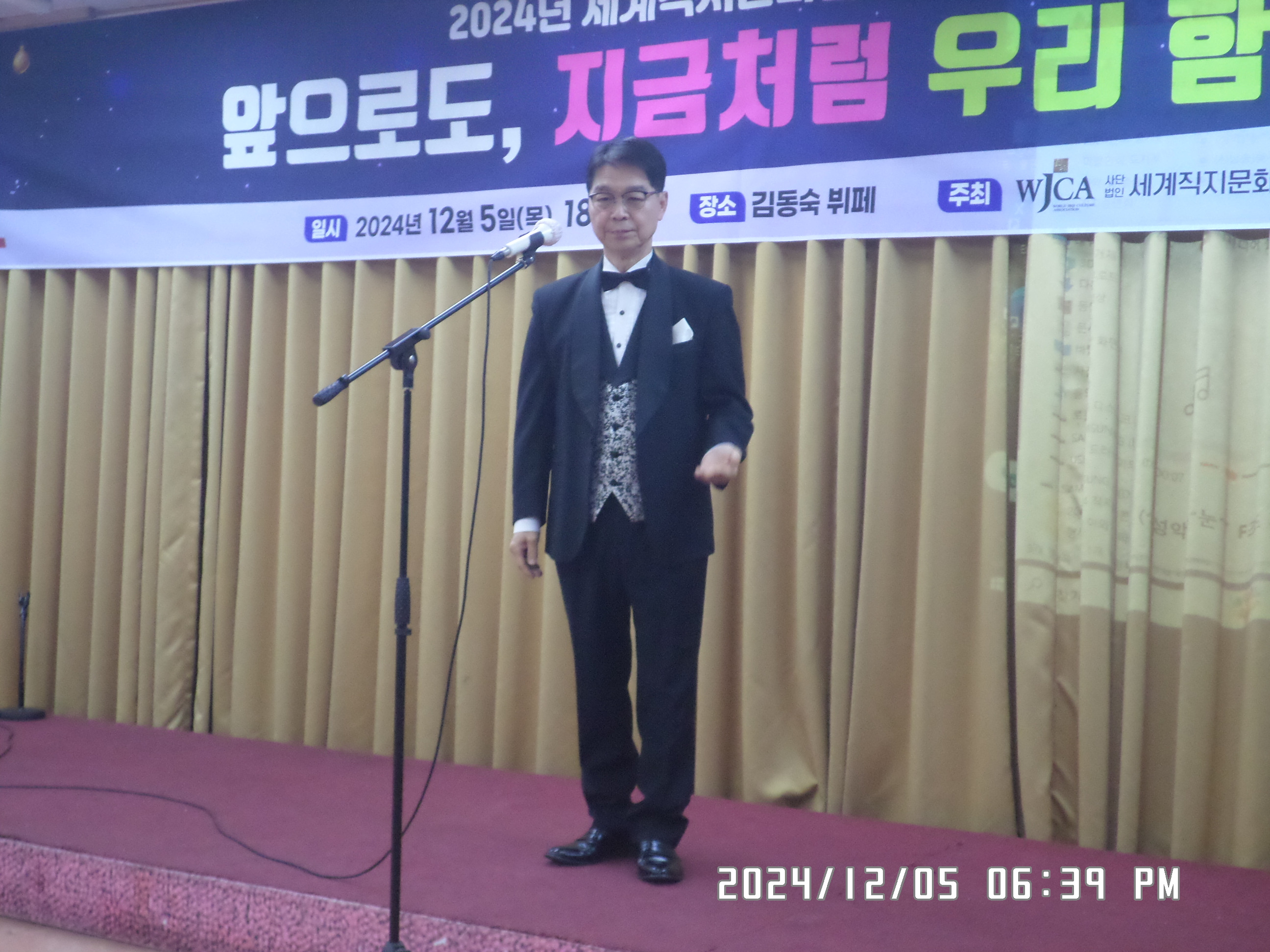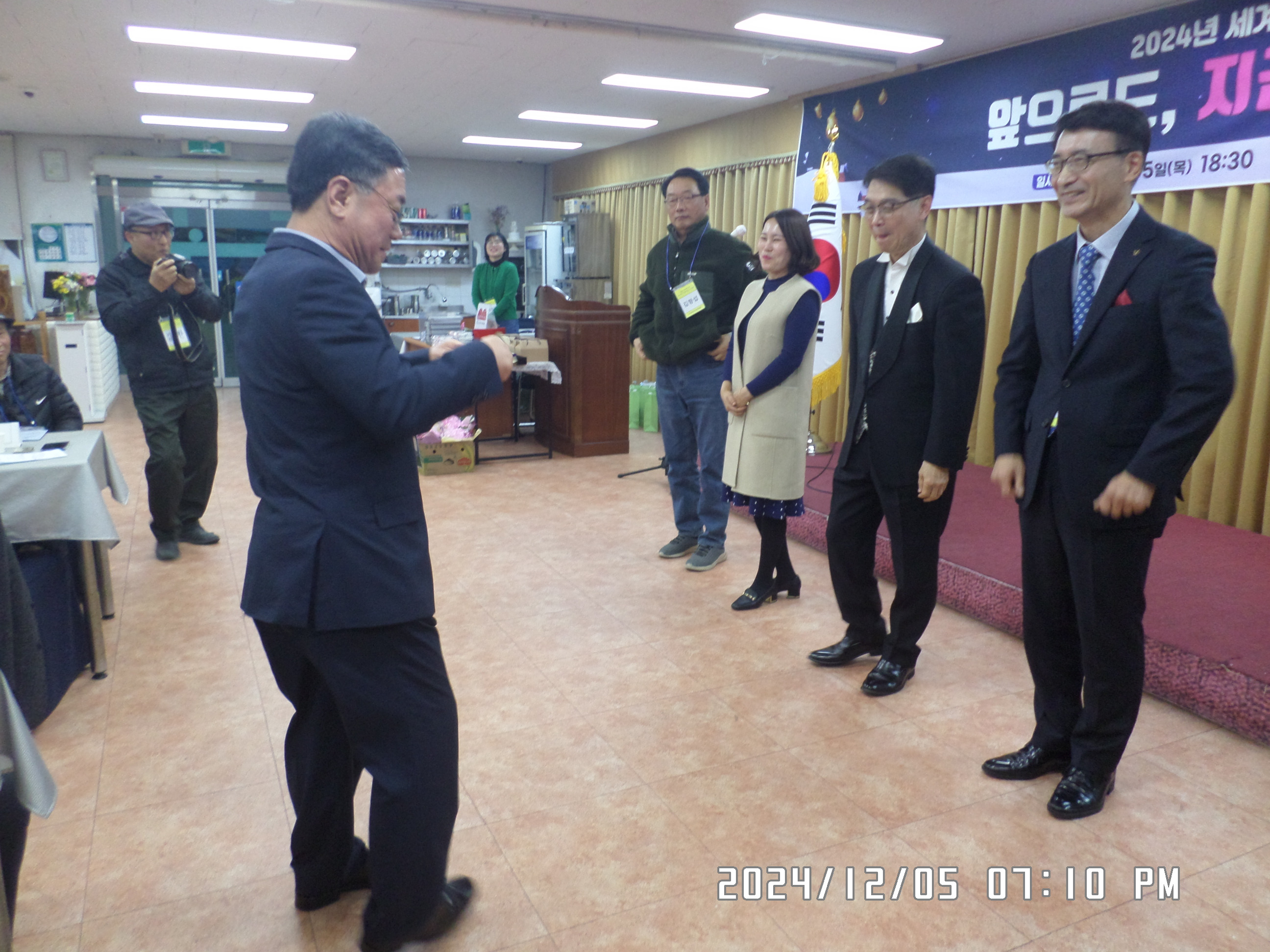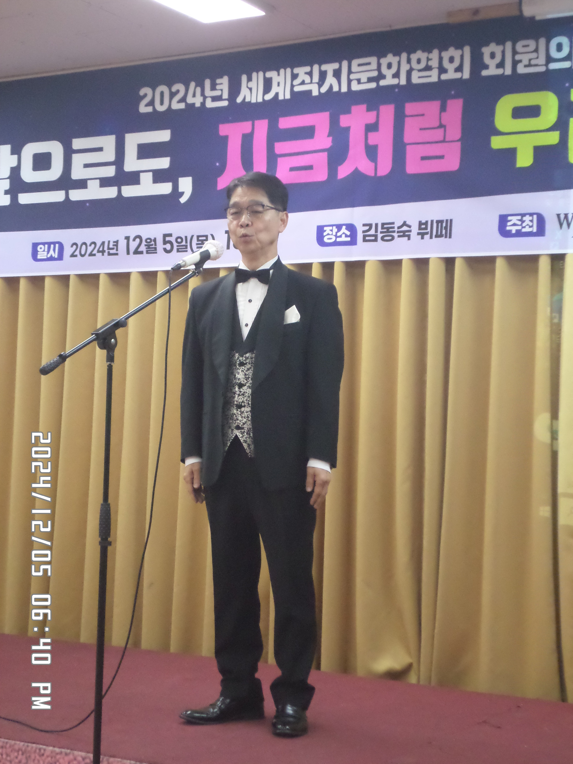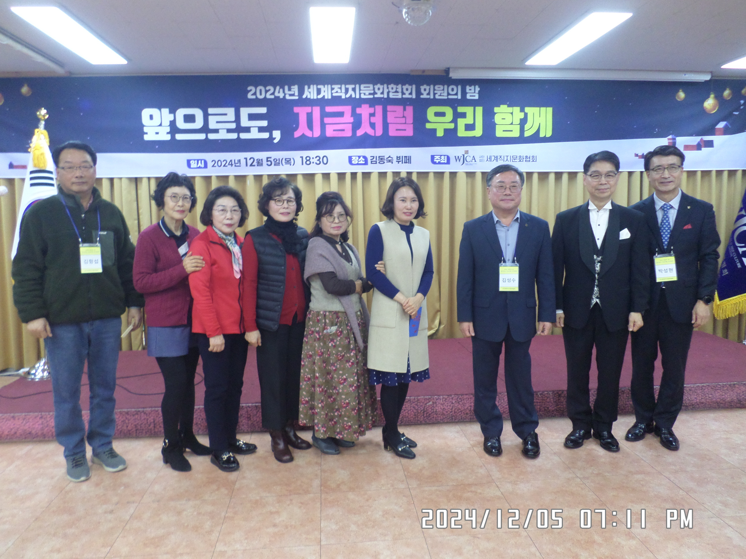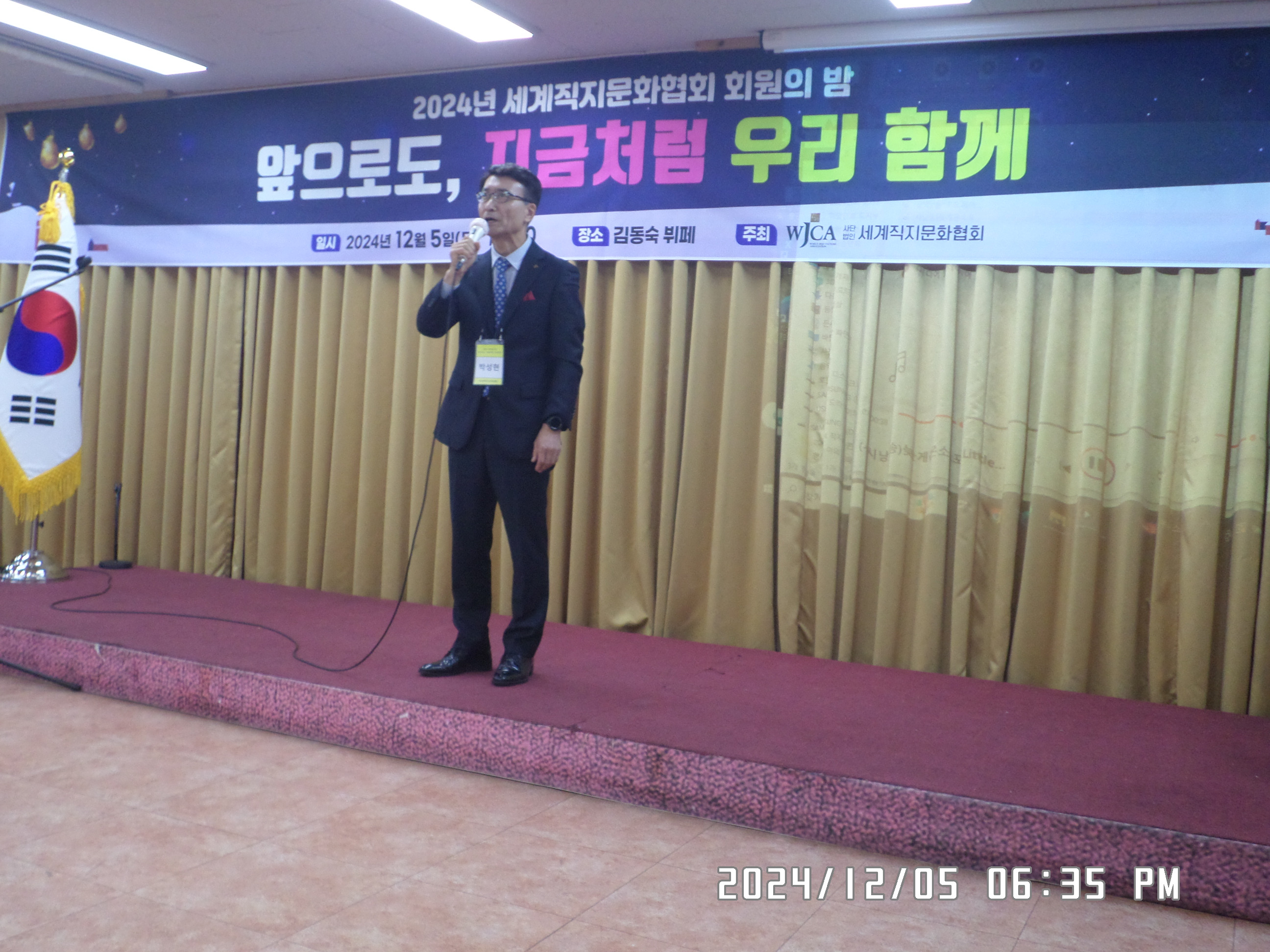 2024년 12월 5일(목요일) 청주시 청원구 우암동 소재 김동숙 뷔페에서 세계 직지문화협회 회원의밤 행사가 세계직지문화협회 김 성수 협회장님 과 청주시 고인쇄 박물관 전 용운 관장님 을비롯하여 여러 귀빈님들과 많은 회원들이 참석하여 식전공연에이어 협회 활동영상을 시청후 김 성수 협회장님의 환영사 및 축사후 우수회원에대한 시상 및 감사패 전달을 마치고 오늘의 만찬으로 행복한 시간의 사진을 업로드합니다. 수상자분들께 함께 축하해 주시고 회원님들 甲辰년 마무리 잘해주시고 희망찬 乙巳년에는더욱더 가족과함께 康寧 하시고 幸福 과 幸運이 恒常 함께 하시기를 祈願 합니다.