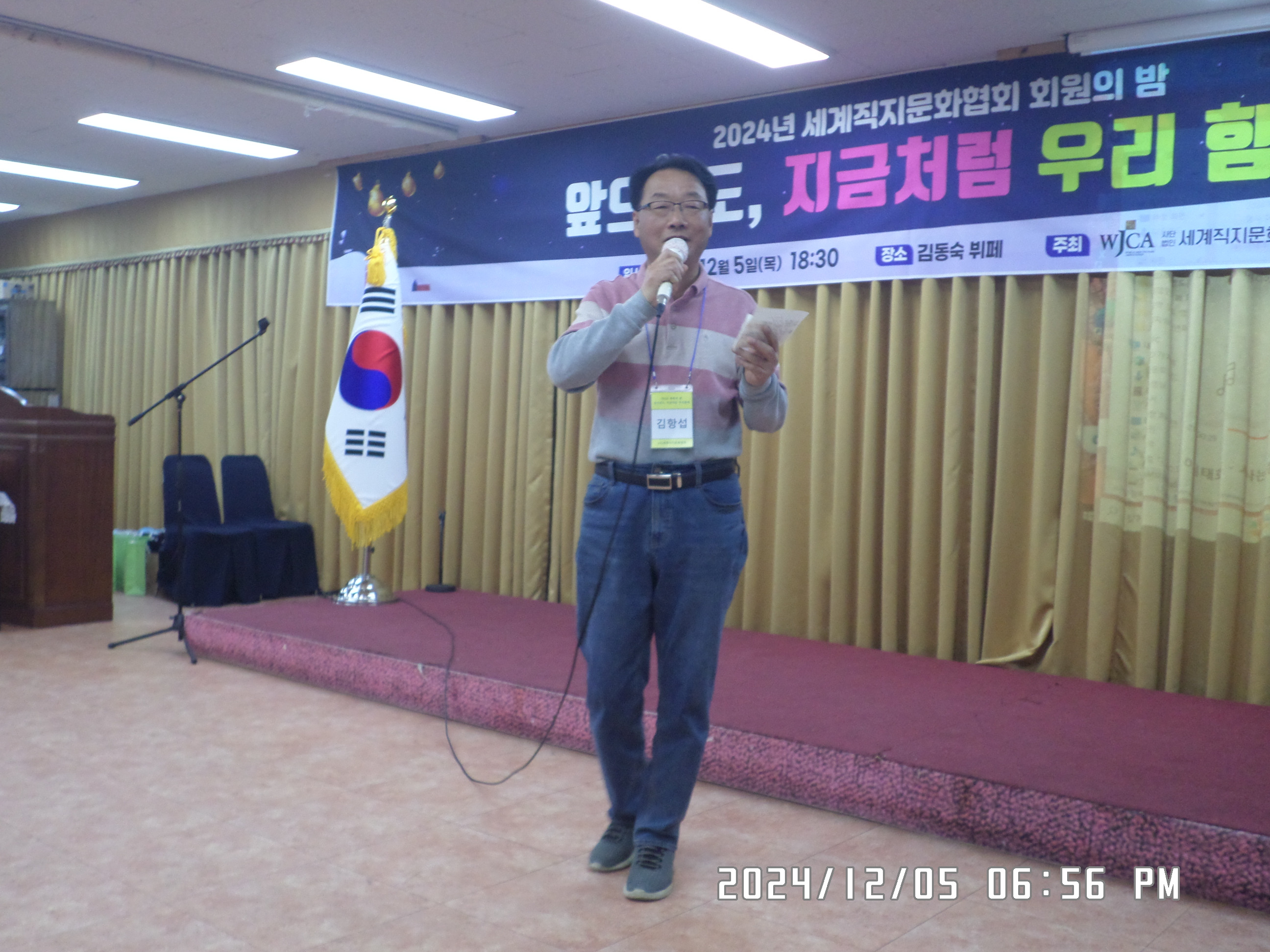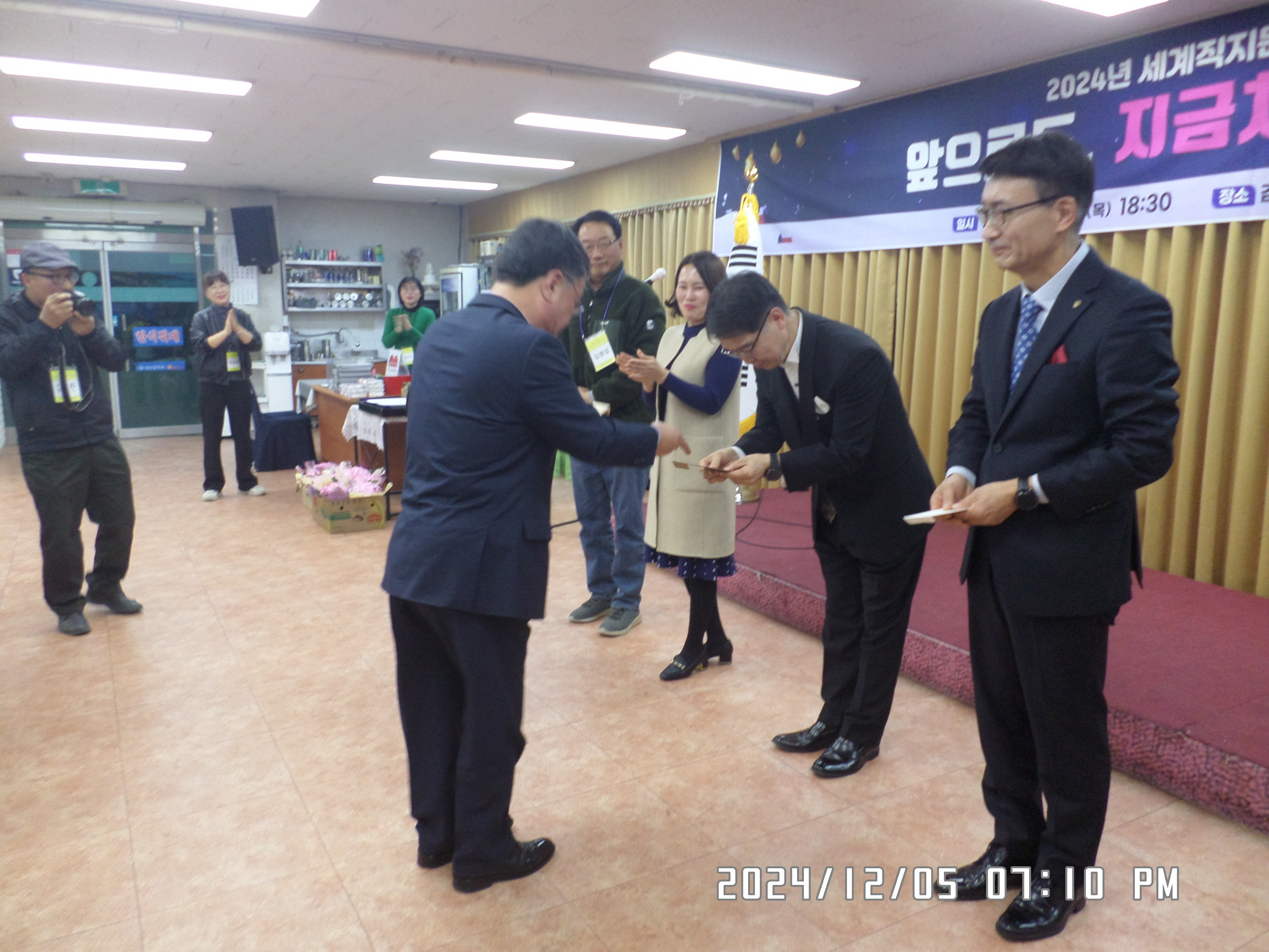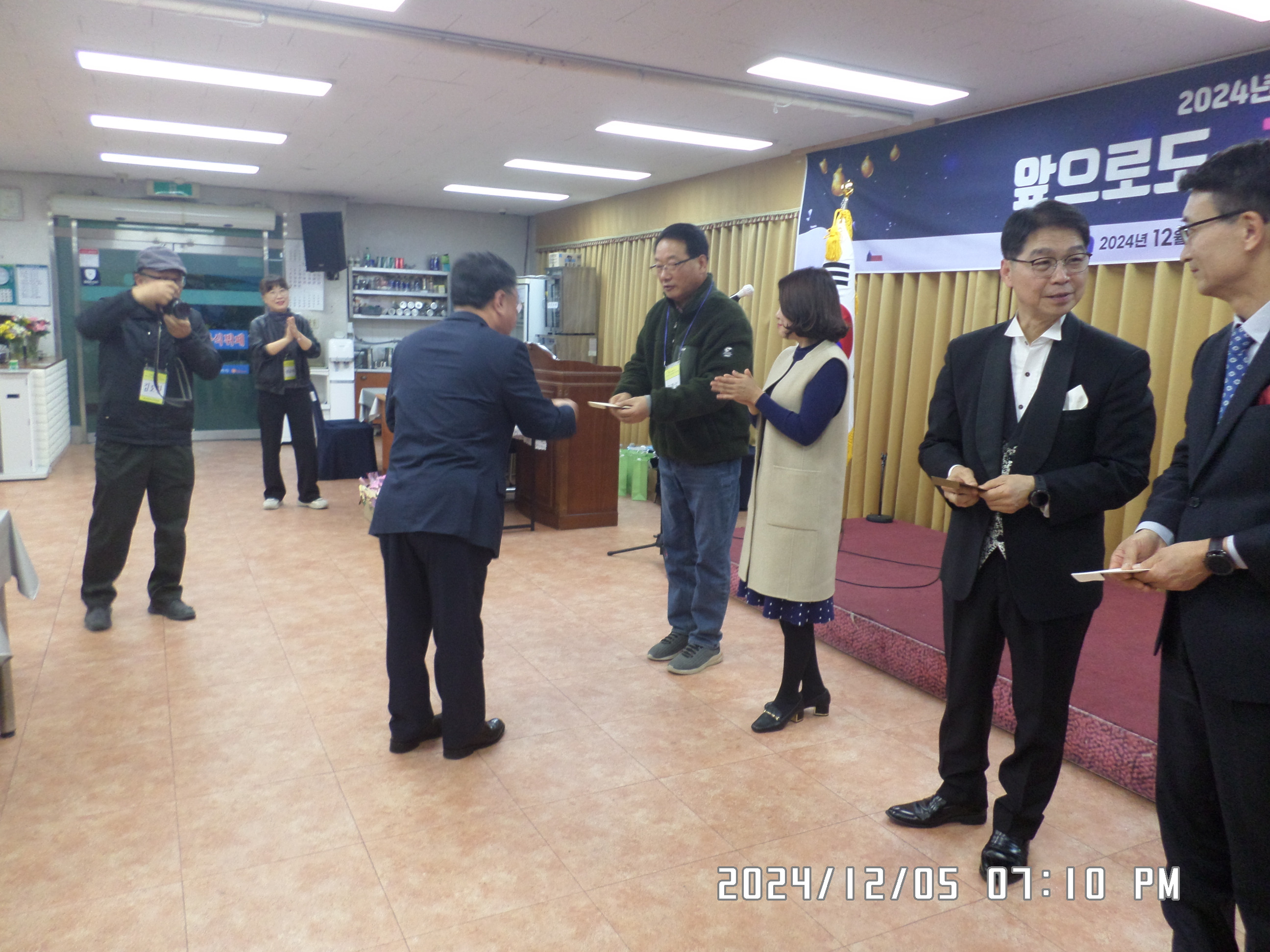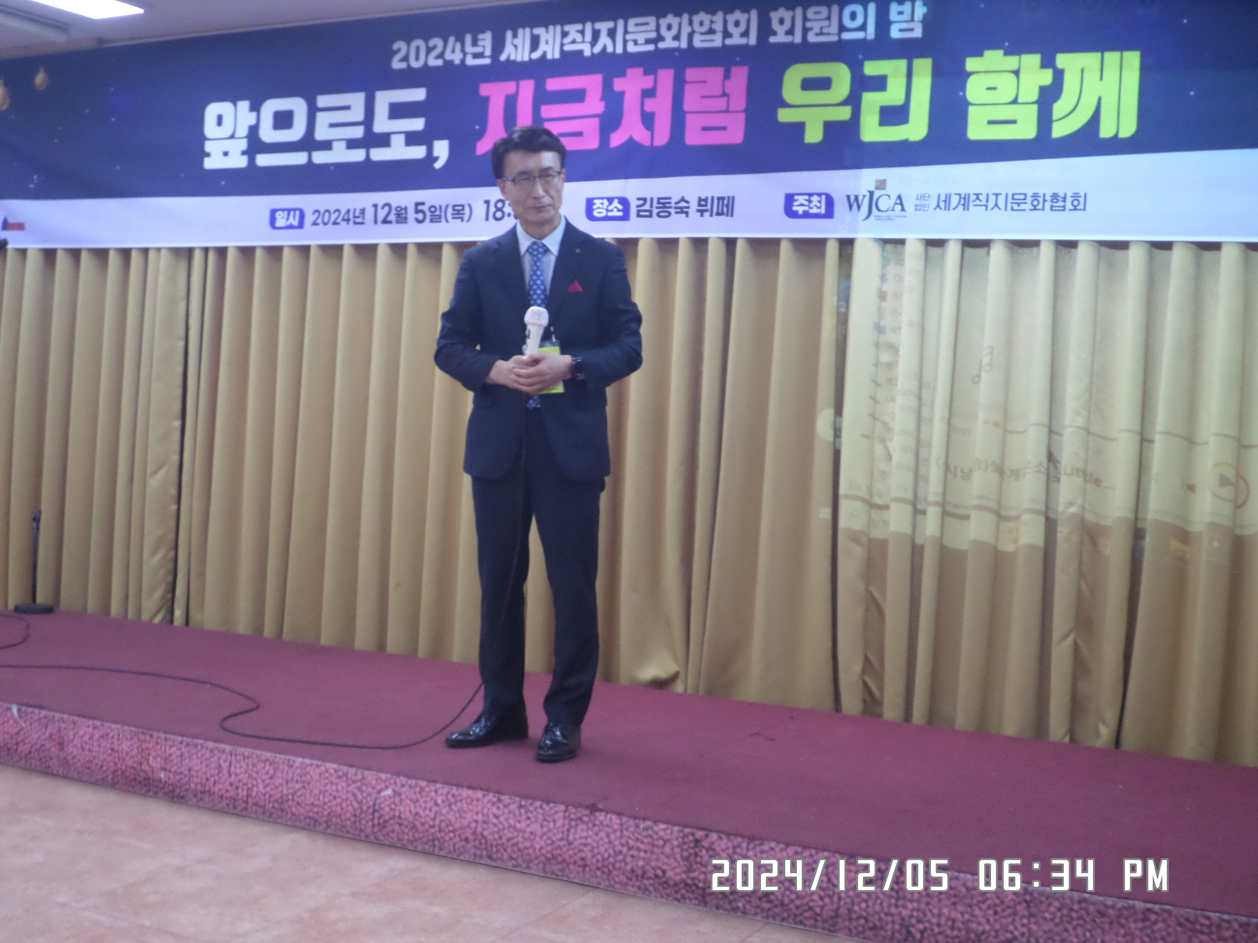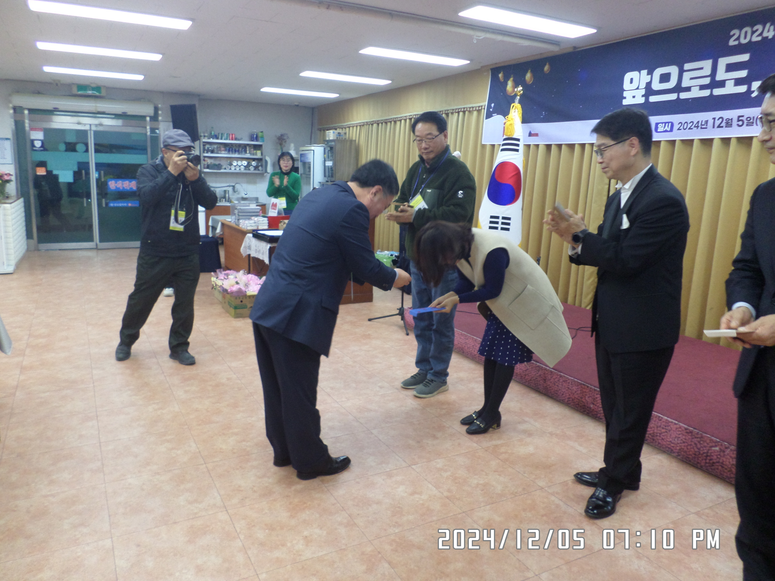 2024년 12월 5일(목요일) 청주시 청원구 우암동 소재 김동숙 뷔페에서 세계 직지문화협회 회원의밤 행사가 세계직지문화협회 김 성수 협회장님 과 청주시 고인쇄 박물관 전 용운 관장님 을비롯하여 여러 귀빈님들과 많은 회원들이 참석하여 식전공연에이어 협회 활동영상을 시청후 김 성수 협회장님의 환영사 및 축사후 우수회원에대한 시상 및 감사패 전달을 마치고 오늘의 만찬으로 행복한 시간의 사진을 업로드합니다. 수상자분들께 함께 축하해 주시고 회원님들 甲辰년 마무리 잘해주시고 희망찬 乙巳년에는더욱더 가족과함께 康寧 하시고 幸福 과 幸運이 恒常 함께 하시기를 祈願 합니다.