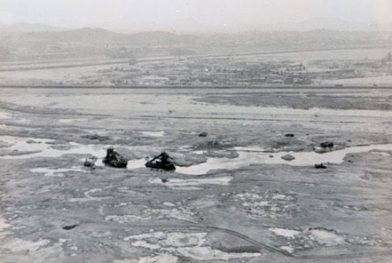 이곳은 강폭이 350m, 깊이 4m로서 500여대의 중장비로 매일 13만 입방미터의 흙을 메웠다.