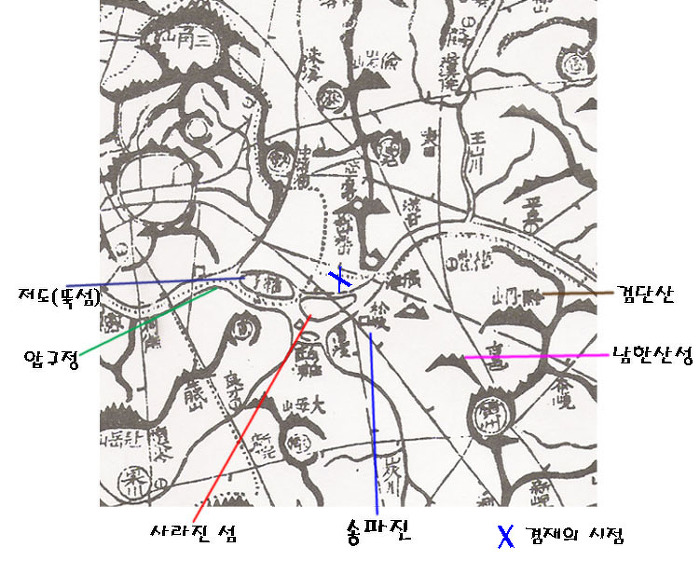 한강은 지금과는 달리 광나루 쪽에서 직선으로 흘러가는 지금의 흐름과는 달리