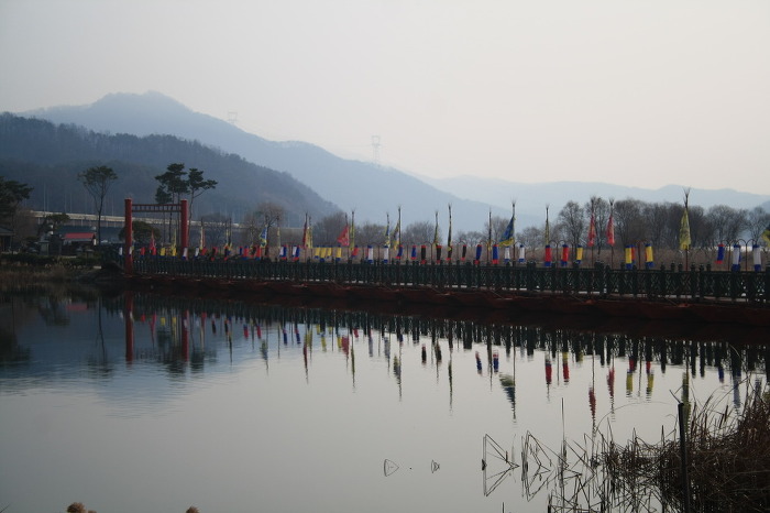 송판 위에는 사초(莎草:잔디)를 깔았다. 배다리의 폭은 24척(약 7.2미터).