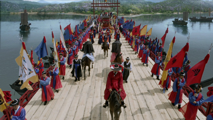 배다리의 폭은 24척이었으므로 아홉 사람이 일렬로 나란히 걸어갈 수 있었다.