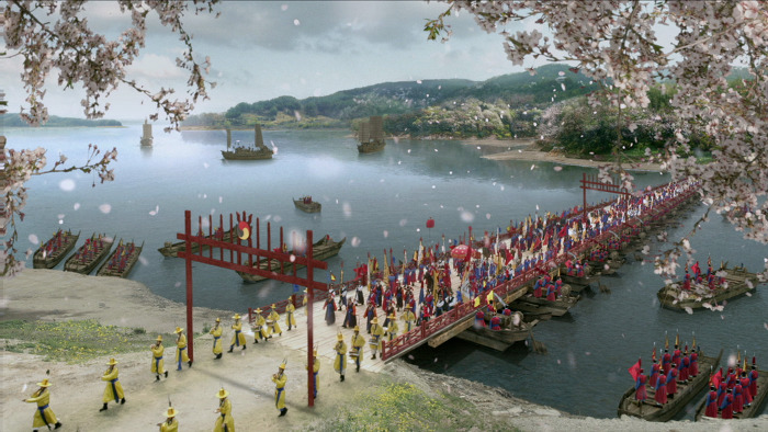 화성으로 가는 행렬을 보기 위해 배다리를 중심으로 한강의 양쪽 연안에 백성들이 구름처럼 몰려들었다.