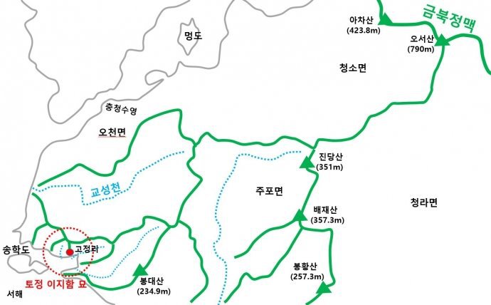 이곳의 산맥은 금북정맥의 오서산(790m)에서 비롯된다.