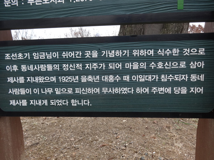 "조선초기 임금님이 쉬어간 곳을 기념하기 위하여 식수한 것으로 이후 동네사람들의 정신적 지주가 되어