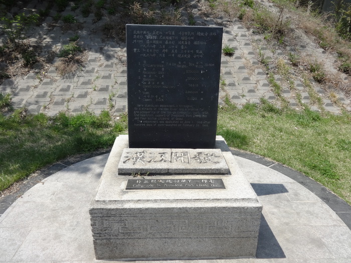 마포대교 남단 동쪽 언덕 아래 작은 잔디밭에 '漢江開發'비가 있다.'漢江開發' 글씨는 박정희 대통령이 썼다고 비문은 밝히고 있다.