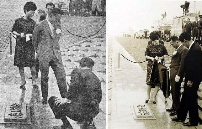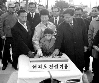 1967년 12월 25일 성탄일 여의도에서 거행된 '여의도 건설 기공식'이다. 박정희 대통령과 육영수 여사 그리고 아들 박지만 군,김현옥 서울시장이 여의도 개발을 알리는 '버튼'을 누르고 있다.