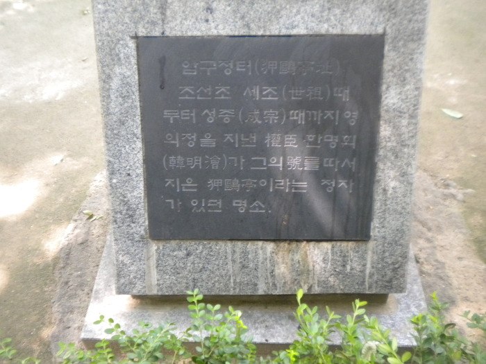 서울 강남구 압구정동 현대아파트 74동과 72동 사이 한명회의 정자 압구정(狎鷗亭)이 자리했던 곳이다.