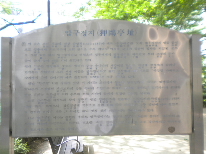 조선 초기 유명한 권신이며 척신이었던 한명회의 정자 압구정(狎鷗亭)이다. 또 그의 호 압구정이다.