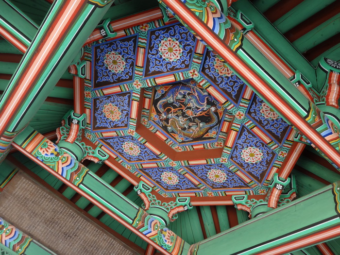 그 가운데 6각형 반자판에 청룡과 황룡이 구름속을 날고 있다.