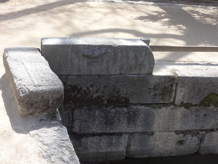 이 연못 동쪽에는 두 개의 석물이 있다. 연못에서 물이 빠져 나갈 때 생기는 소음을 줄여주는 장치라고 한다.