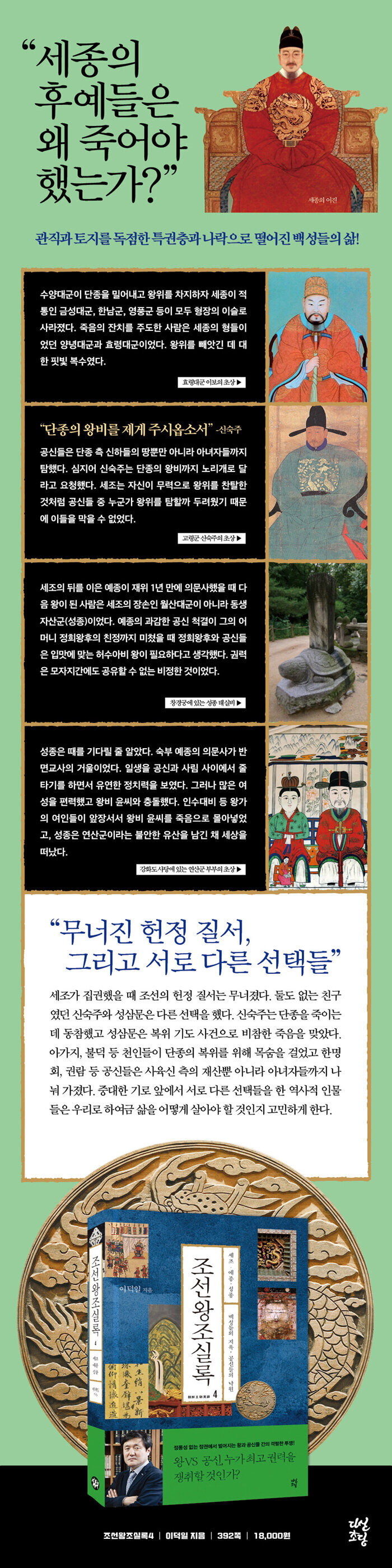 단종의 왕위를 찬탈한 세조 정권의 한계는 뚜렷했다. 정통성이 없는 왕권이었기에 세조는 공신들의 도움을 받을 수밖에 없었다. 즉 공신들과의 연합 정권이었던 것이다. 세종에게 왕위를 빼앗긴 양녕대군과 효령대군이 세종의 가족들과 단종을 죽이는 데 앞장을 섰다. 세조는 공신들에게 관직 매매권과 토지, 그리고 단종 측과 사육신의 아녀자들을 하사했다. 심지어 신숙주는 단종의 왕비를 노비로 하사해달라고 요청했으며 정인지는 세조를 ‘너’라고 불렀다. 무력만 있으면 누구나 왕위를 가질 수 있다는 인식이 팽배하여 봉석주 반란 사건 등이 일어났고 정통성 없는 정권이었기에 명나라의 지지를 얻기 위해 사대 외교로 일관할 수밖에 없었다. 세조의 뒤를 이은 예종은 공신들을 견제하며 왕권을 강화하려 했지만 단 1년 만에 의문사했다. 성종은 26년 동안 재위했음에도 별 치적이 없었고, 성종이 성군이라고 알려진 것은 세조 대의 혼란기에 비할 때의 반사이익이 컸다. 중대한 기로 앞에서 서로 다른 선택을 한 역사적 인물들은 오늘날 우리로 하여금 어떤 삶을 것인지 고민하게 한다.