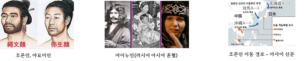 일본 고대인들을 인류 계통학적으로 분류하면 조몬인 (縄文時代: 기원전 14,000 ~ 300년) , 야요이인(彌生時代: 기원전 300년~기원후 300년)으로 구분할수 있습니다. 이후에 일본 열도 일왕가와 직접 연결되는 고분시대로 이어지게 됩니다. 또한 조몬인들에 대해서도 훗가이도 지역의 아이누 보다는 주류가 동남아시아에서 이주한 남만계 이주민들이라는 것이 최근 유전자 연구 결과로도 증명되었습니다.