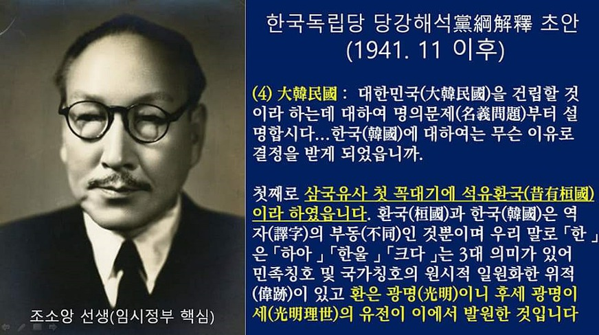 한국독립당의 대표이자, 삼균주의”를 만들어 오늘날 헌법의 기초를 만든 임시정부 조소앙 선생은 삼국유사의 첫 꼭대기에 “석유환국(昔有桓國)이라하였읍니다.”라고 했으며 환국(桓國)과 한국(韓國)은 한울, 크다는 뜻으로 같은 뜻(역자의 부동)임을 알렸습니다.