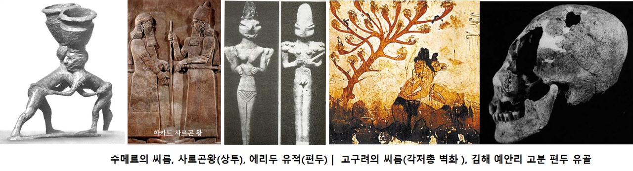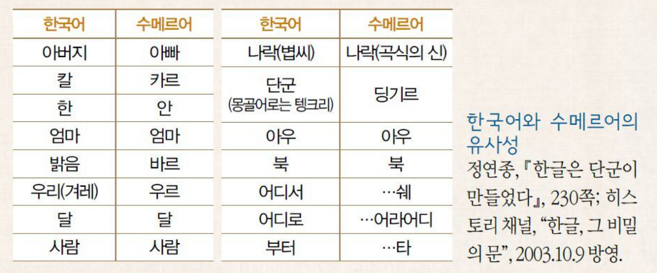 수메르 언어는 한국어와 같은 어근에 접사가 붙는 교착어일 뿐 아니라 60진법을 사용하였고 상투를 틀고 씨름을 즐기며 동이족과 같은 편두와 순장 풍습이 있었다고 전해 집니다.