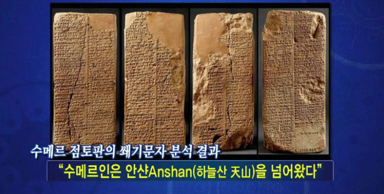 크레이머S. N. Kramer 박사가 수메르 점토판 해석을 통해 "그들은 안산(천산)을 넘어서 왔다."는 기록을 찾았고 이는 그들이 동방의 지역에서 이동 했음을 말해주고 있습니다.