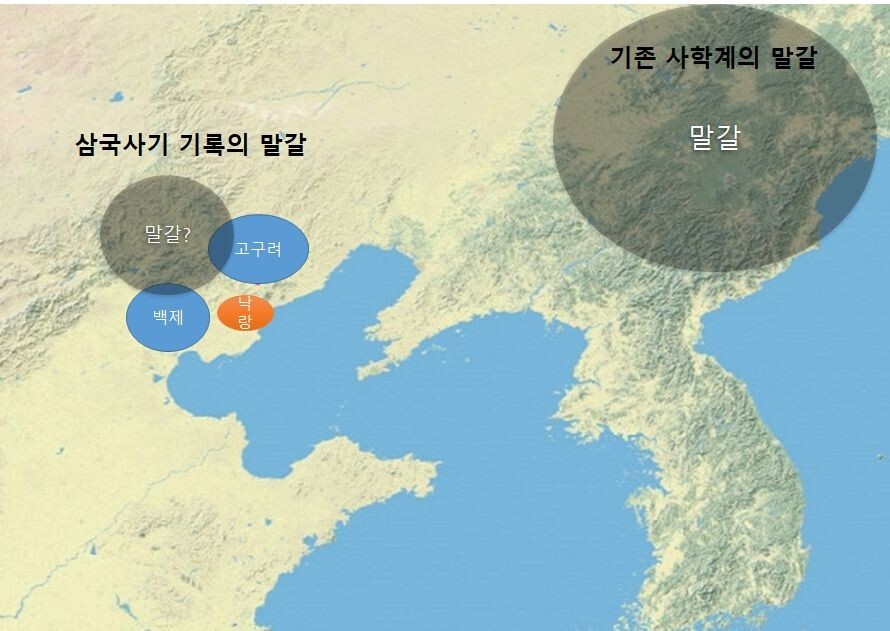 이를 지도에 표시해 보면 백제과 고구려와 충돌하는 말갈의 위치는 다음과 같으며, 이는 우리가 알고 있는 말갈의 위치와는 전혀 다른 위치입니다.