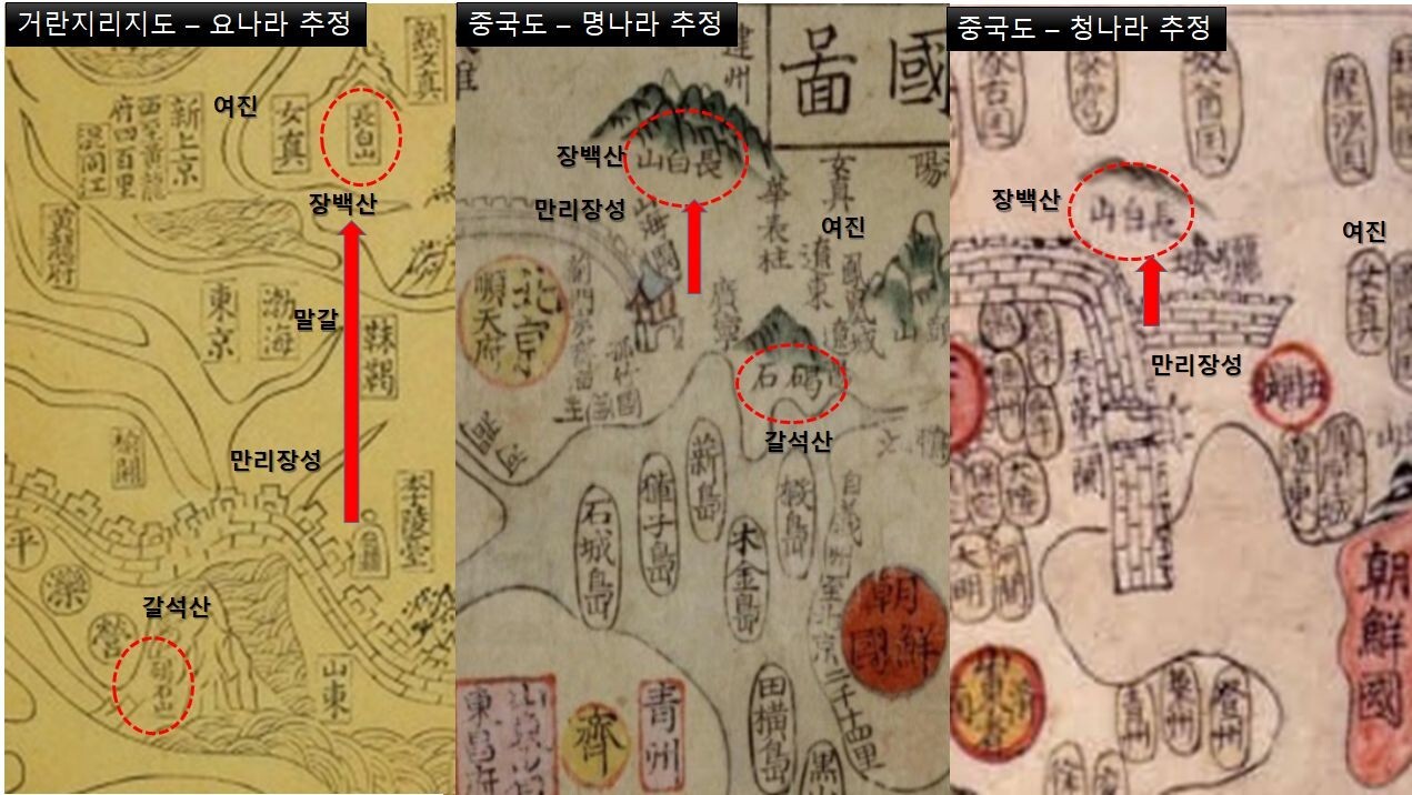 다수의 중국 고지도를 보면 백산말갈(白山靺鞨)이 거주한 (장)백산이 만리장성의 북쪽에 일관되게 표시되어 있습니다.