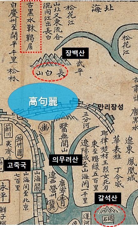 즉 말갈의 주요 거주지인 흑수(黑水)와 백산(白山)은 모두 만리장성의 북쪽에 있음을 알수 있습니다.