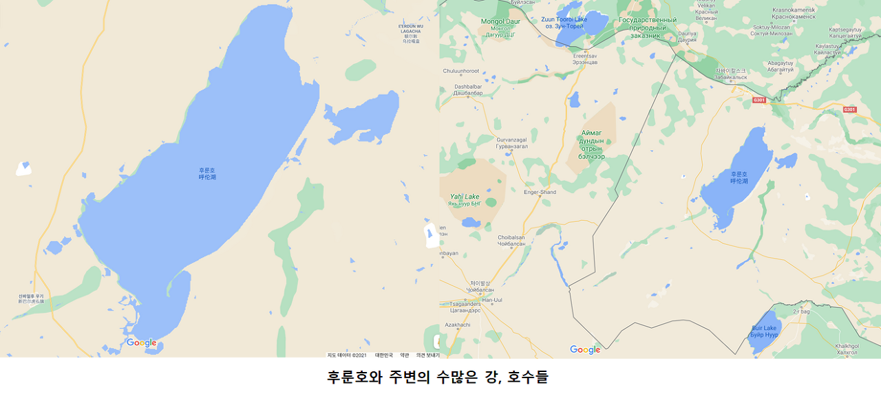 또한 후룬호의 주변을 보면 수 많은 호수와 강이 있음을 알수 있는데, 과거 유량이 풍부할 때는 이들이 하나로 연결된 더 큰 호수였음을 추정해 볼수 있습니다.