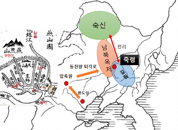 왕이 기병 1천여 기(騎)를 거느리고 압록원(鴨淥原)으로 달아났다...왕이 남옥저(南沃沮)로 달아나 죽령(竹嶺)에 이르렀다.