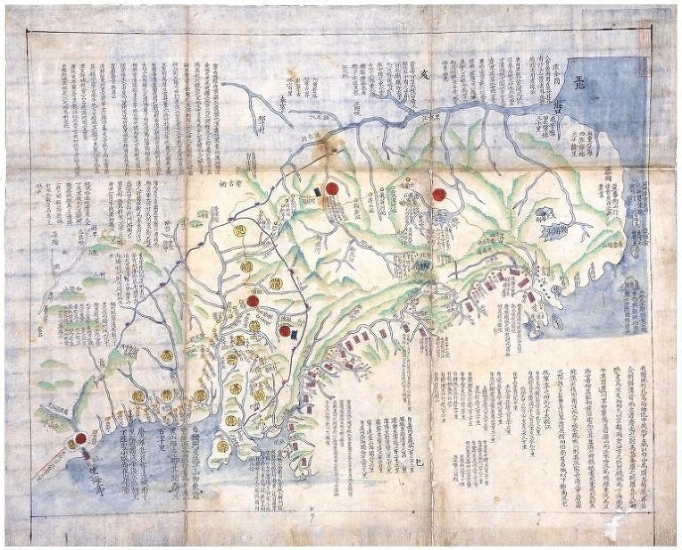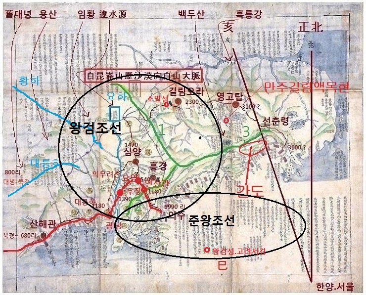 아래는 위 <백산대맥도>를 쉽게 이해하기 위해 도면에 표시된 글자를 확대하고 이조선과 명.청의 문헌 기록에 근거하여 추기한 것이다.