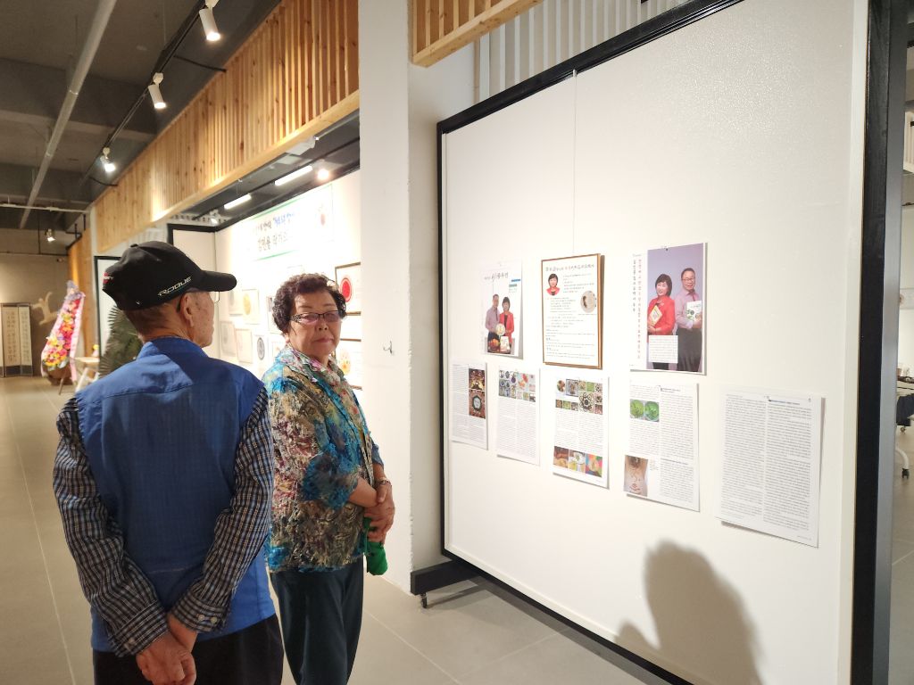 전시장에서 손님들을 맞으며