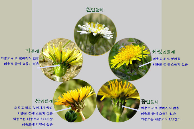 이 중에서 외래종은 서양민들레 뿐입니다. (그러나 전국적으로 개체수가 가장 많다고 보아도 무방함)