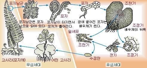 꽃이 피지 않는 민꽃식물들은 모두 포자 번식으로 대표적인 고사리의 예...