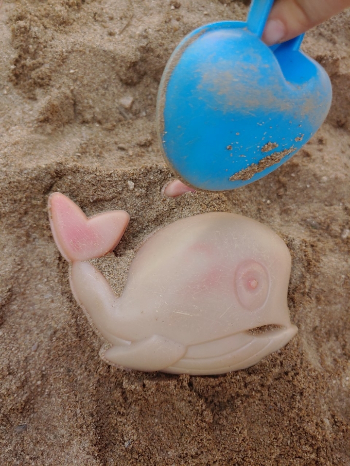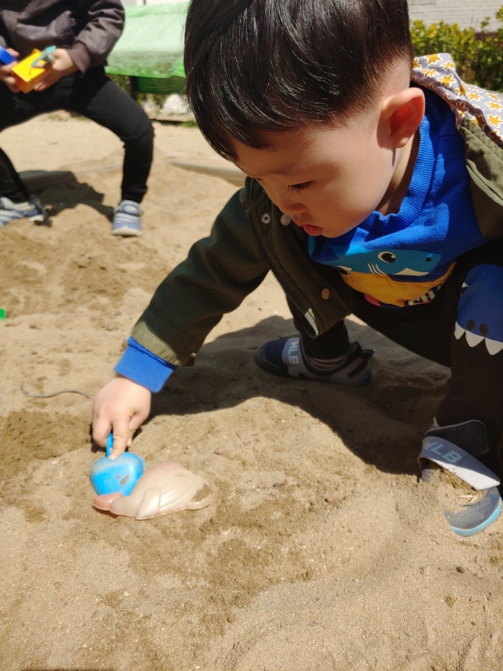 00이는 어린이집에서 처음으로 모래놀이를 해보았어요. 모래놀이 도구함에 내가 좋아하는 고래가 있어요.