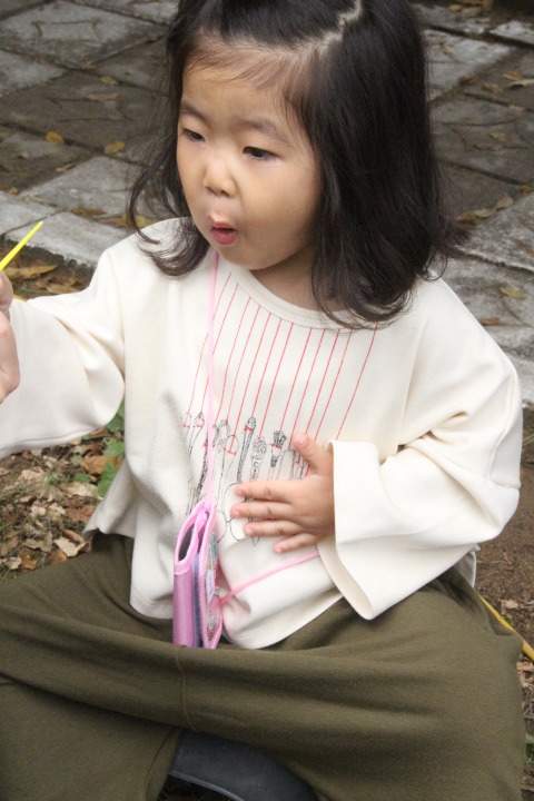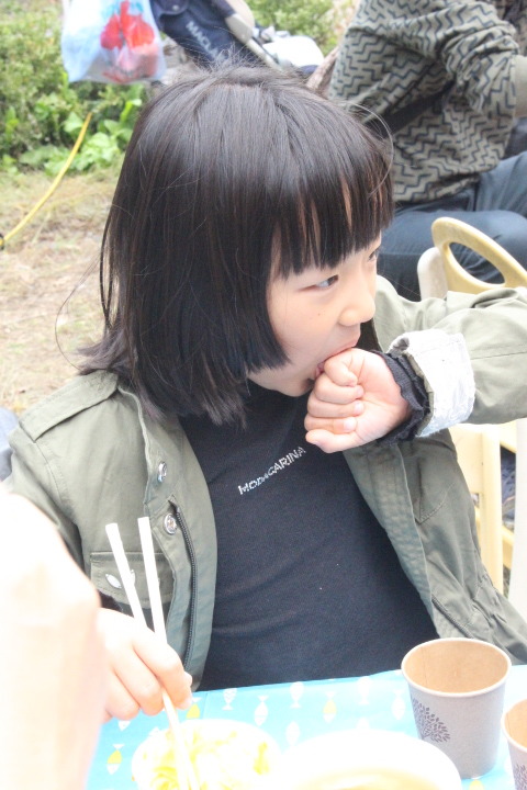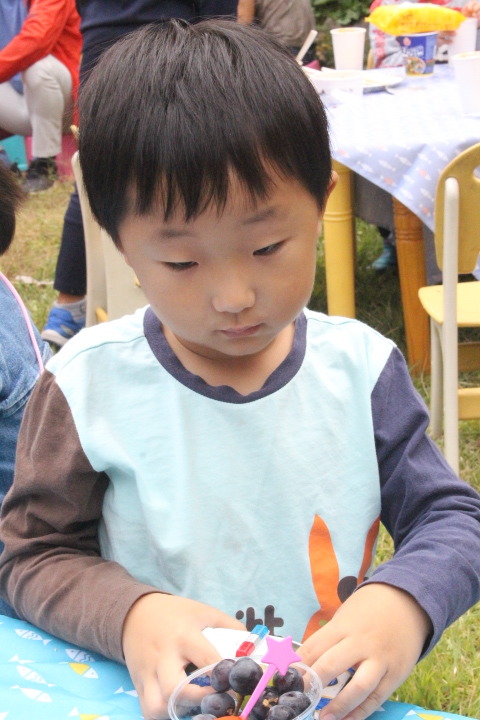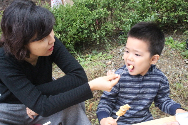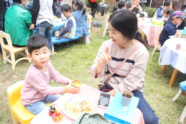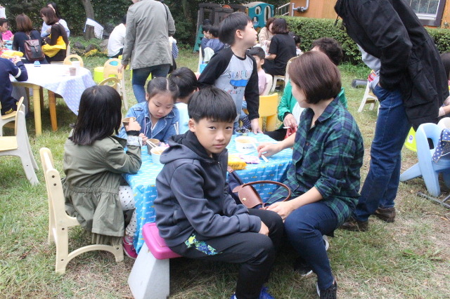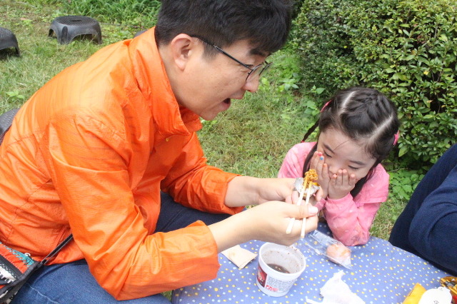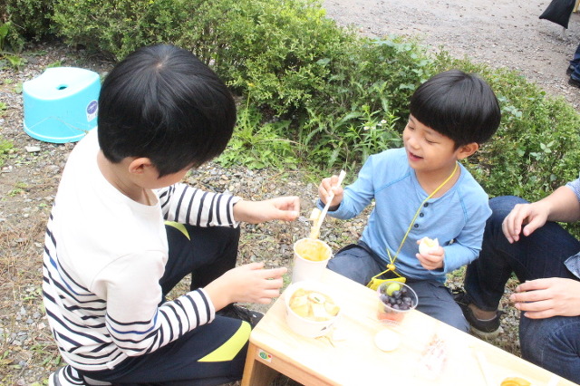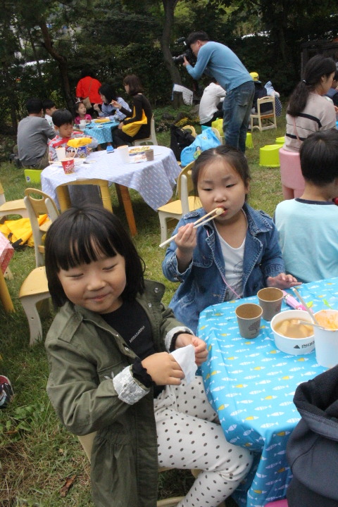 구름송이반 친구들은 우선 먹거리 장터에서 구입한 떡볶이를 가지고 와 자리를 잡았네요.