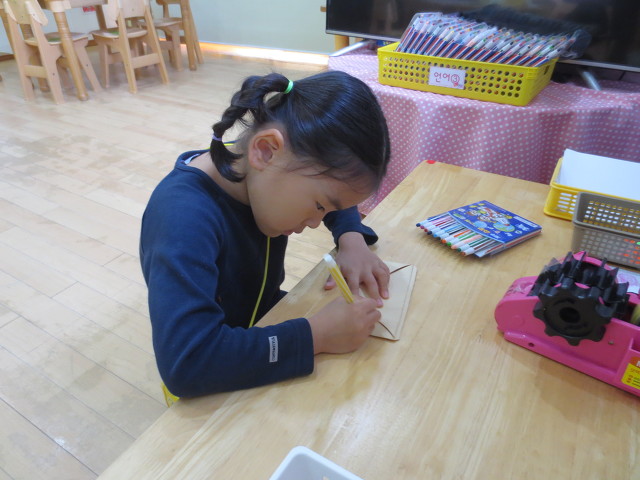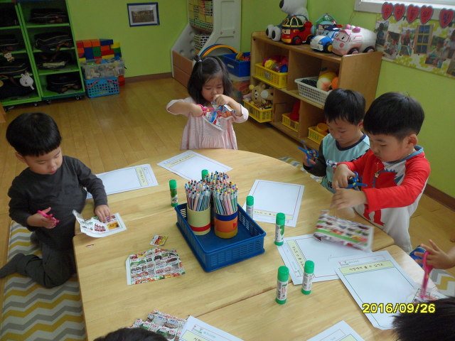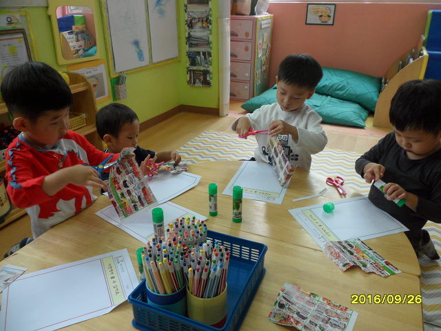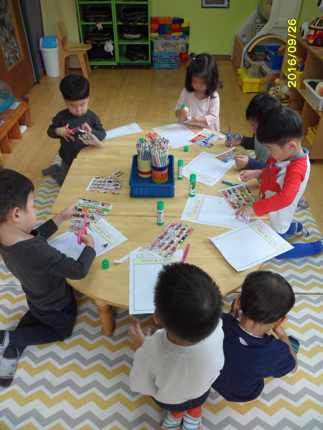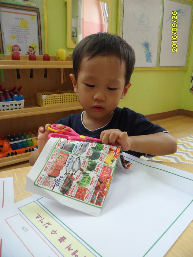 시장 놀이가 있기 전. 애기나리반 친구들은 시장에서 볼 수 있는 물건을 찾아 오리고 붙이고 활동지를 해보았어요.