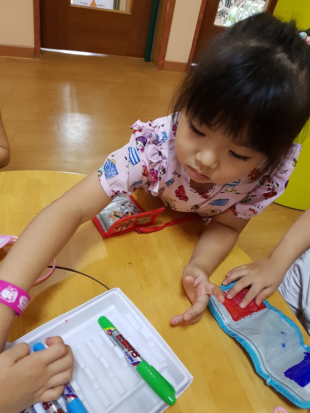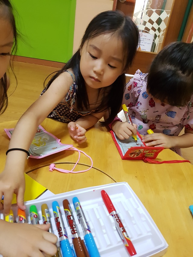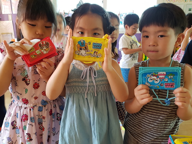구름송이반(만 4세) 친구들이 선생님께서 나눠주신 코인을 지갑에 넣어 보관하여 보았어요.