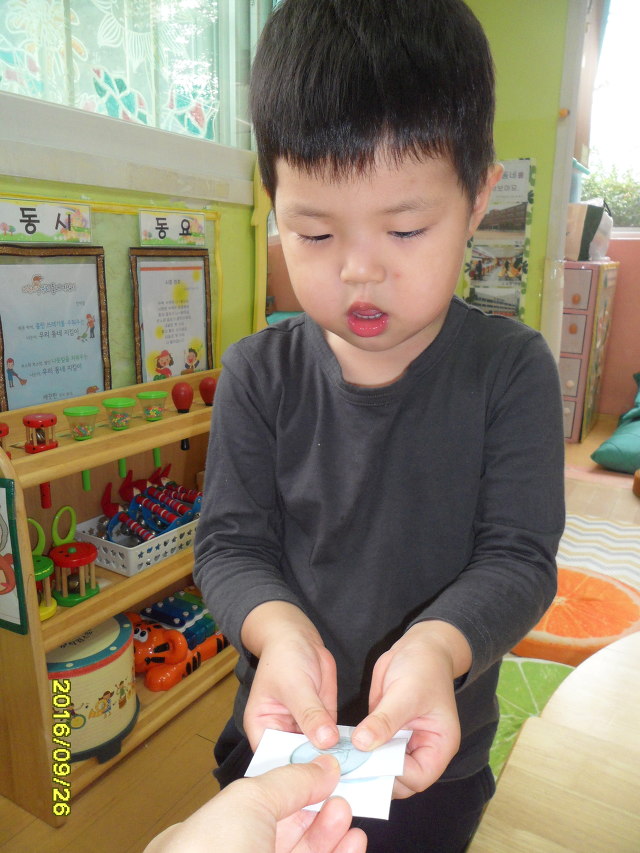 애기나리반(만 2세) 친구들이 물건을 가져오면 한결시장놀이에서 사용할 수 있는 한결돈을 주었어요.
