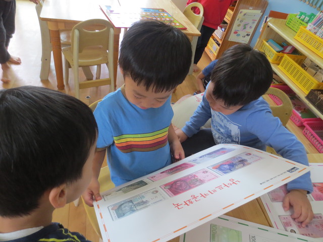 꽃잔디반(만 3세) 친구들이 우리나라 화폐와 각 나라의 화폐의 특징에 대해 알아보았어요.