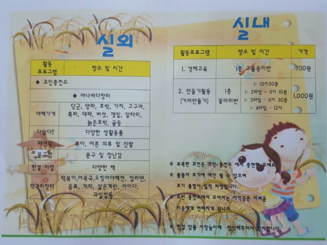 - 활동코너:야채가게, 다있다(생활용품), 패션왕(옷가게), 문구점, 한결 서점, 먹거리 장터, 코인충전소,