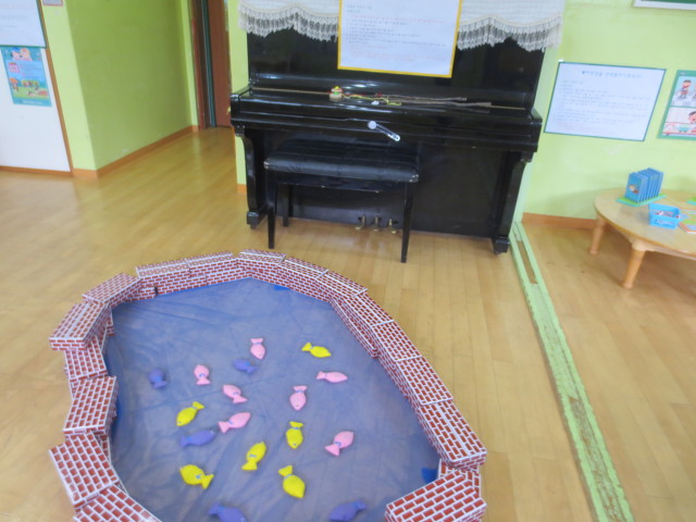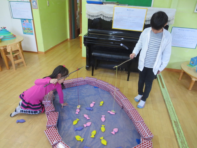 오빠와 사이좋게 낚시놀이를 하고 있어요.