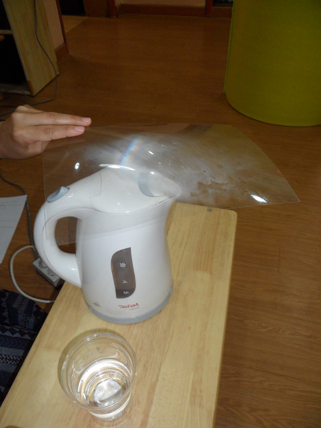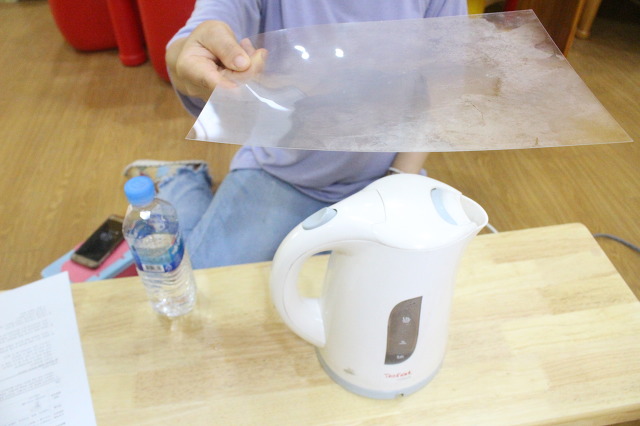OHP필름이 어떻게 변해갈까요? 뜨거운 김이 나오자 투명했던 OHP필름이 하얗게 되었어요. 하얗게 된 건 무엇일까? -물이요!