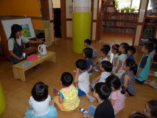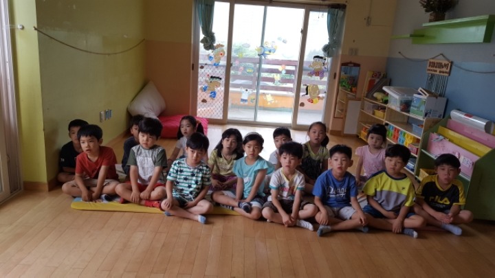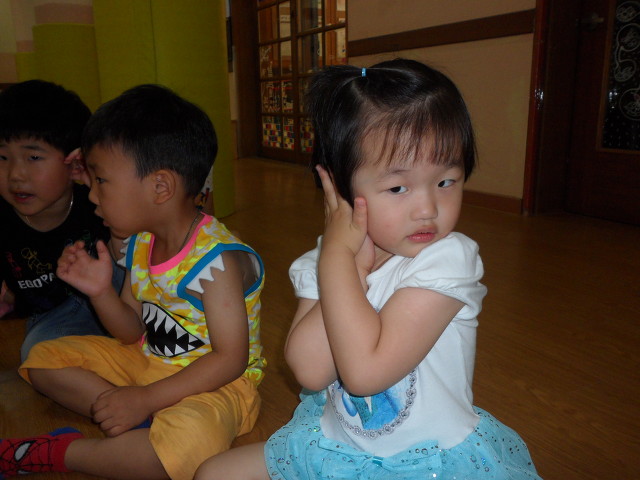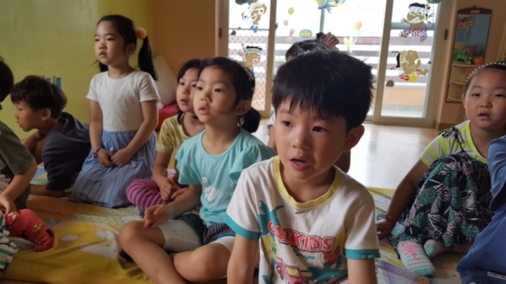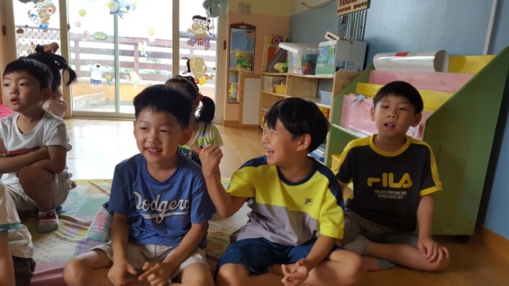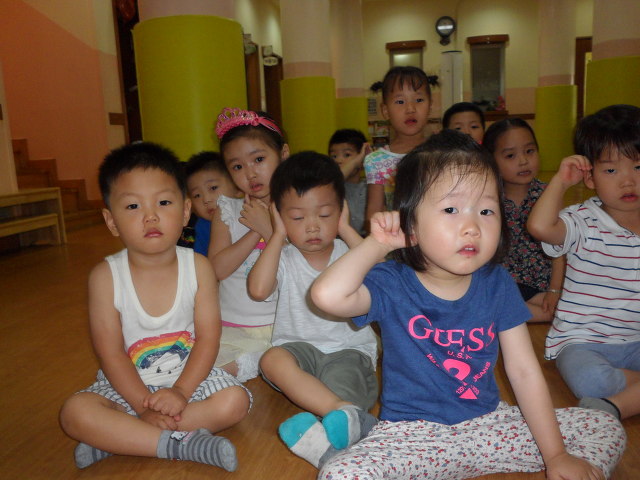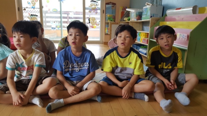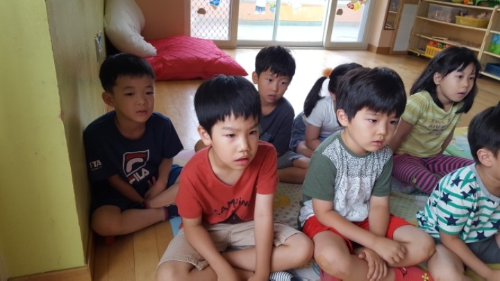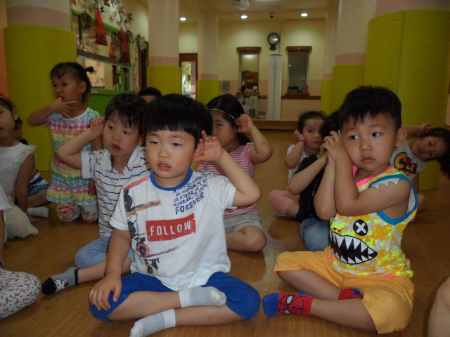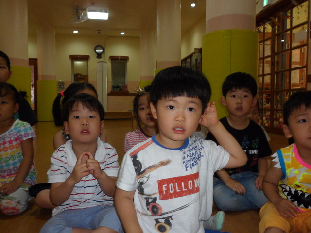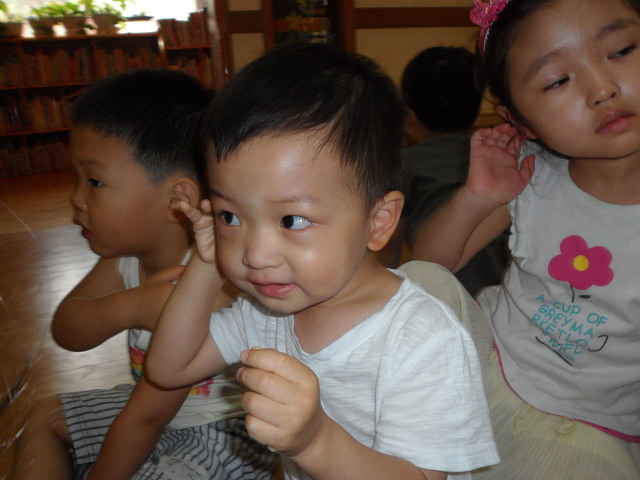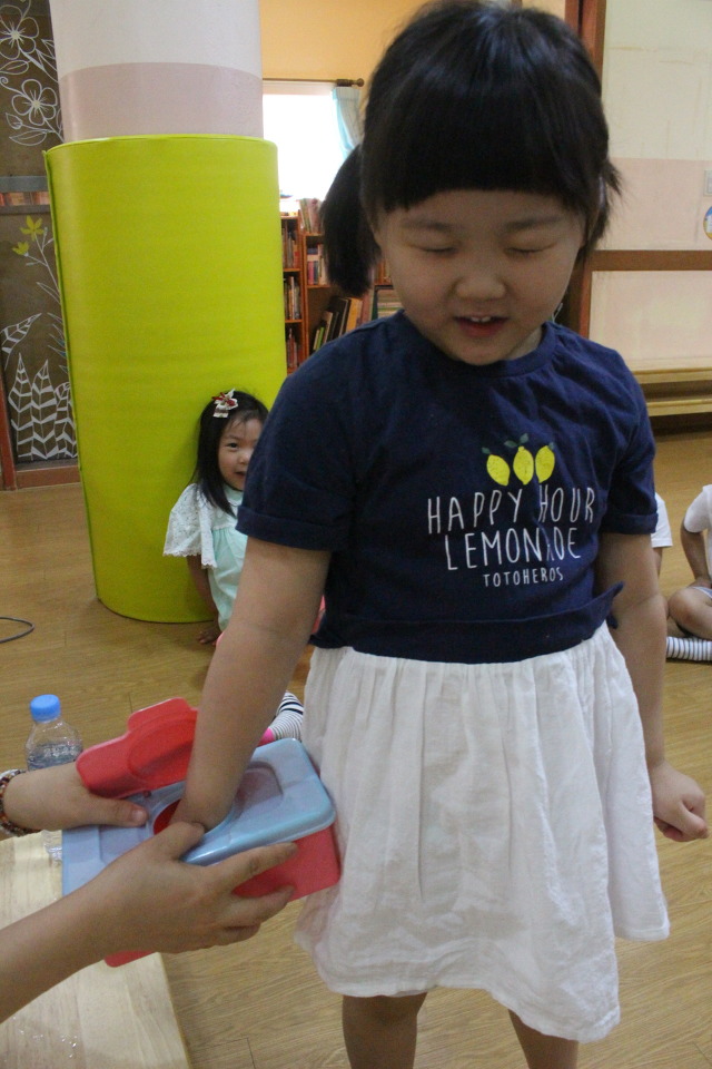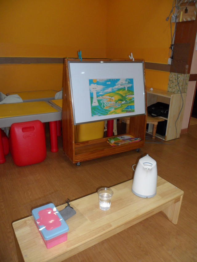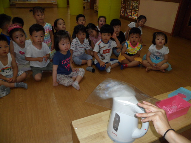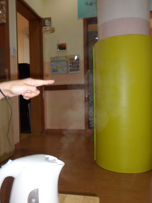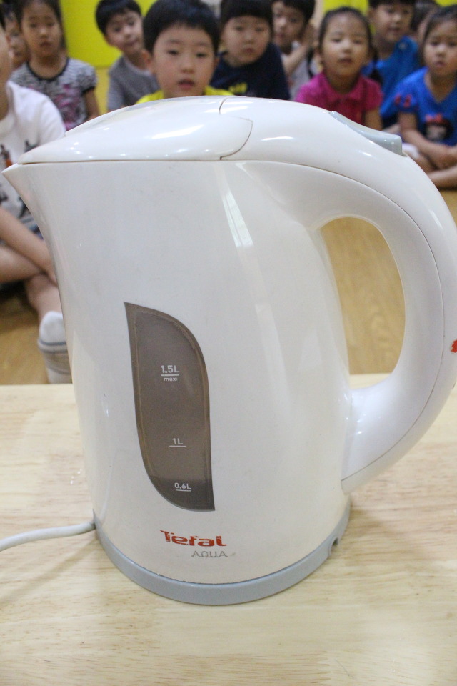 (전기주전자에 가까이 가면 물이 뜨거워지기에 뜨거운 물에 대한 안전교육을 한 후 멀리서 물이 끓는 소리를 들었습니다.)