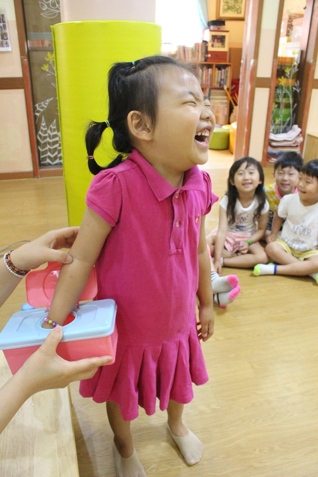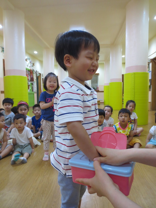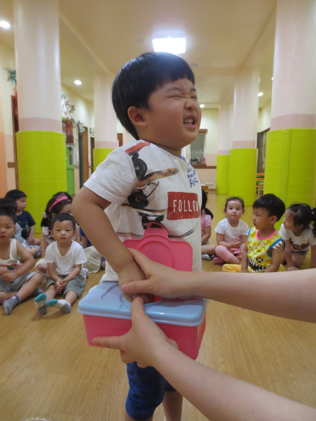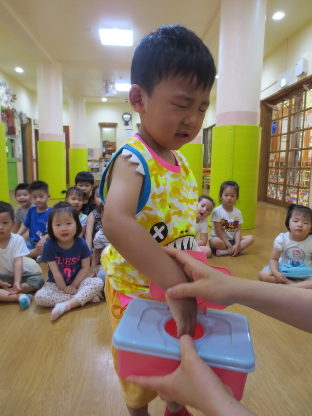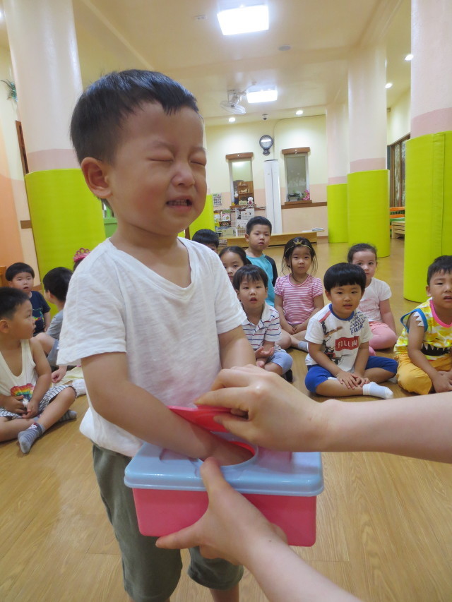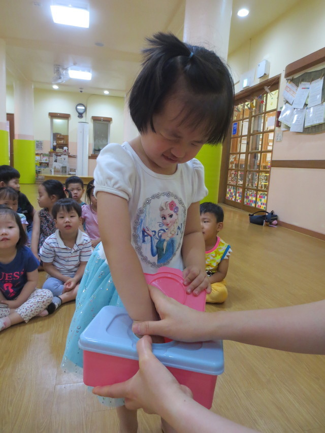 한명씩 나와서 상자 안에 손을 넣어보기로 해요...절대 친구들에게 무엇이 들어 있는지 말하지 않기!