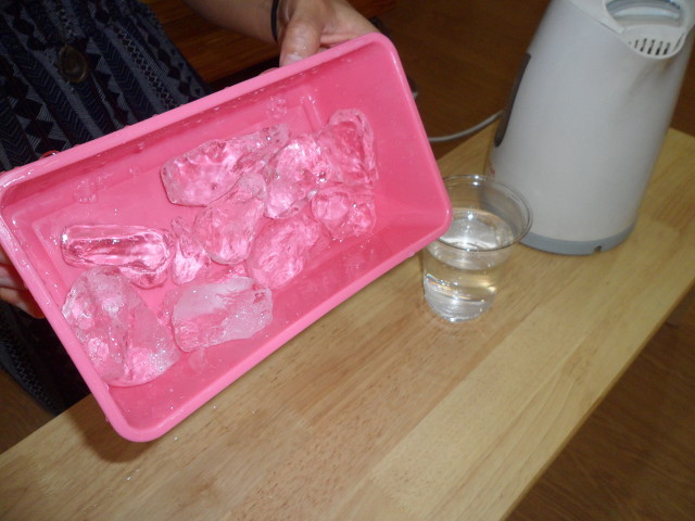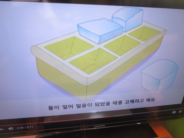 물의 모양이 딱딱하게 얼음(고체)으로 변해져 있었네요.
