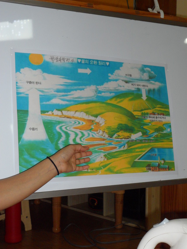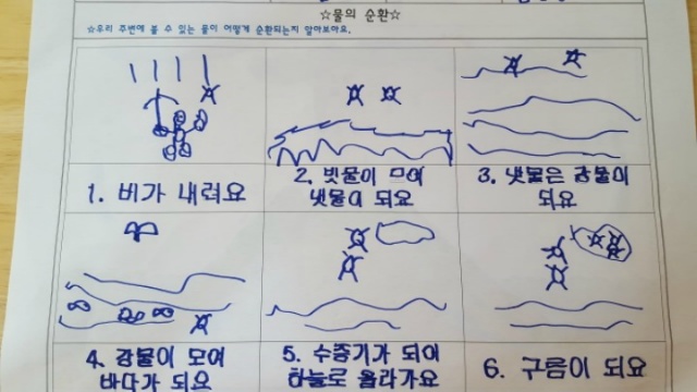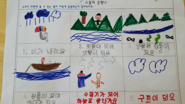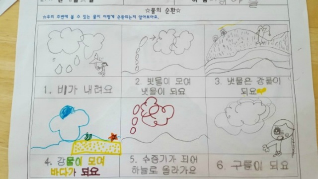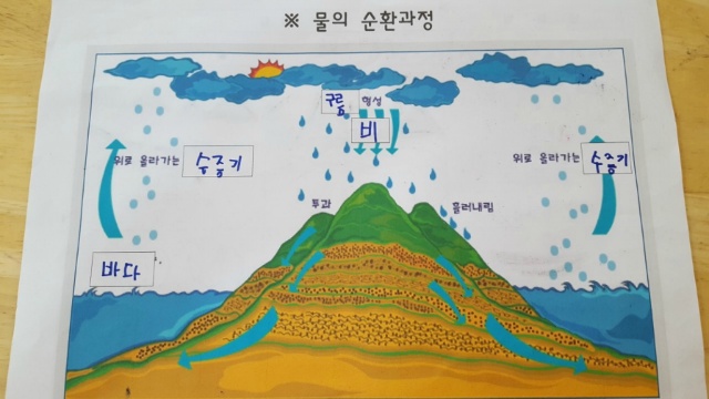 영상과 실험을 통해 물의 순환과정을 알아보고 다시 한 번 물의 순환그림을 통해 반복해 보았습니다.