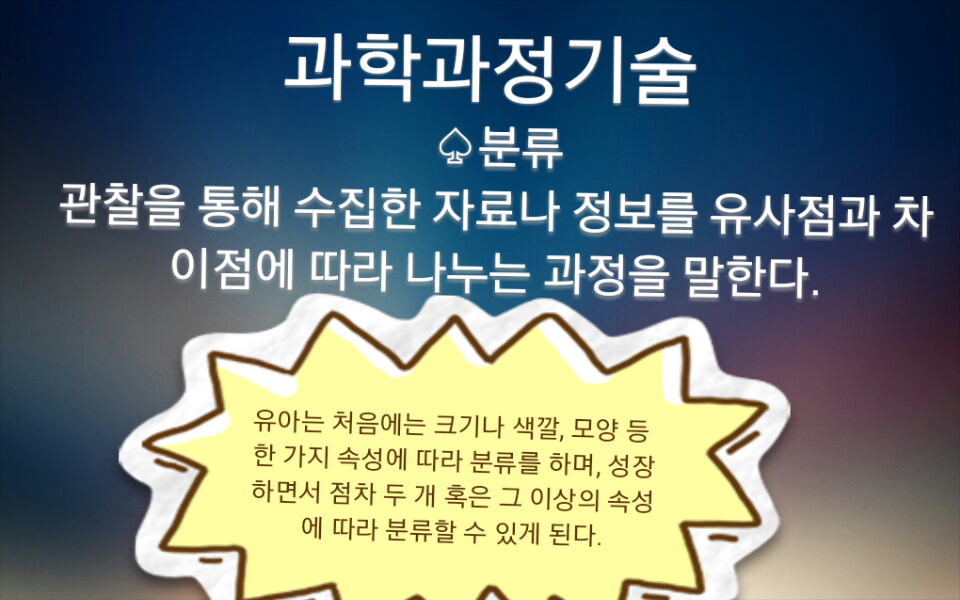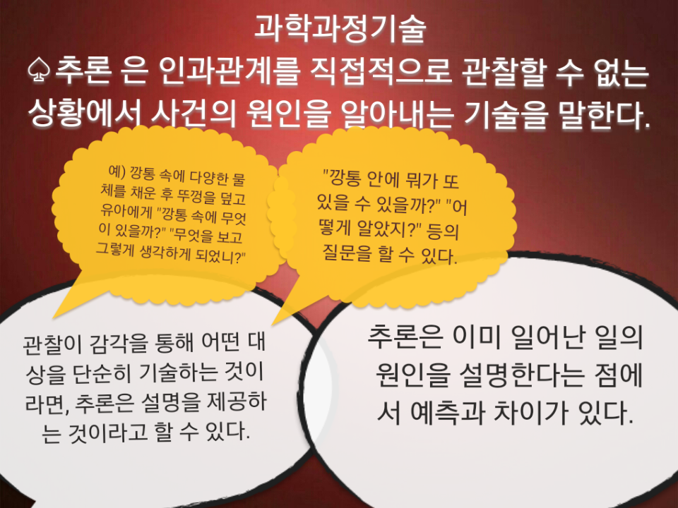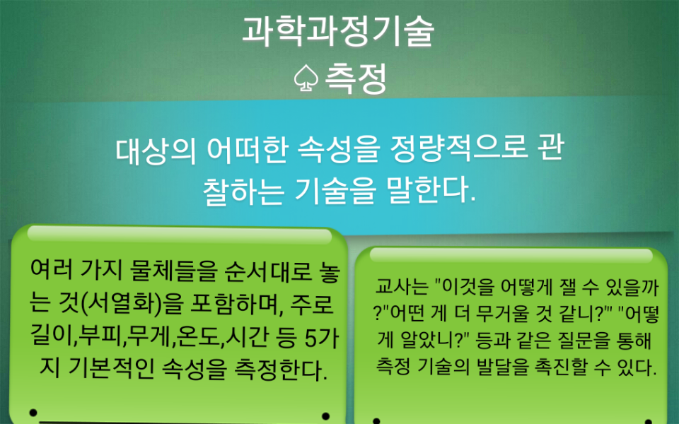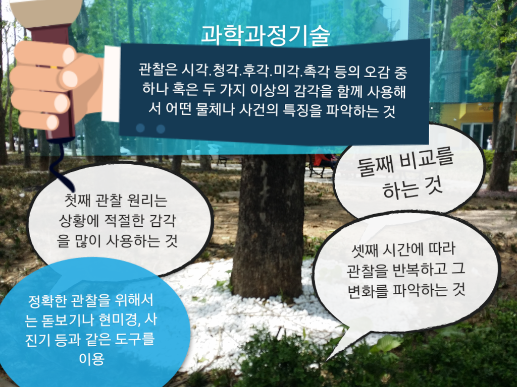 과학과정기술에는 관찰, 분류, 측정, 의사소통, 예측, 추론, 실험등이 있다.