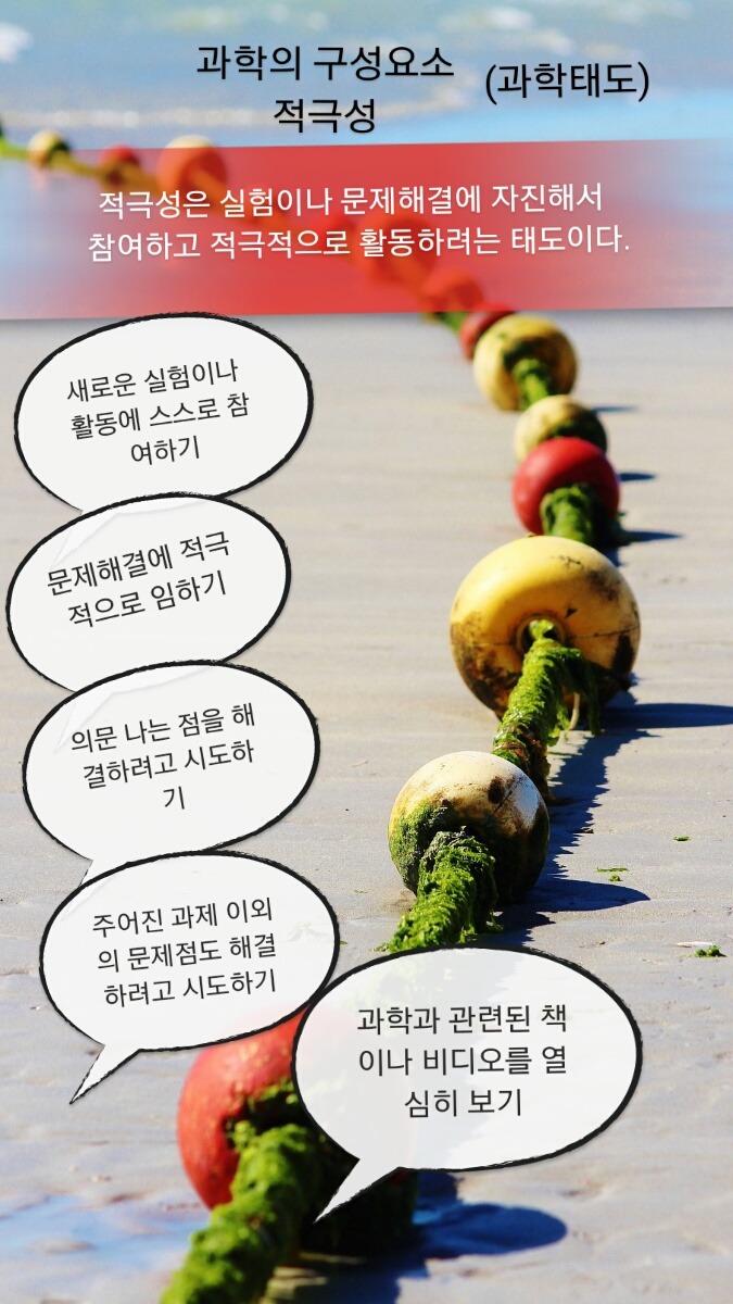 과학태도를 구성하는 요소 중 호기심, 적극성, 솔직성, 객관성, 개방성, 비판성, 판단유보, 협동성, 끈기성을 들 수 있다.