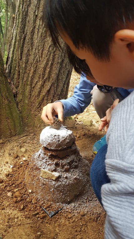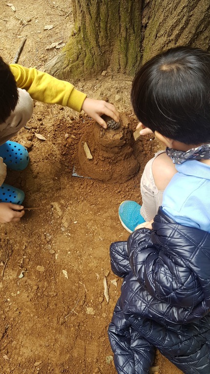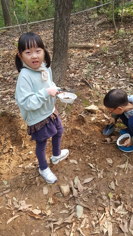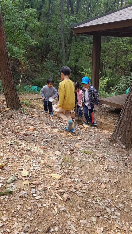 모래 파기를 통해 모래를 퍼 담기도 하고 쏟아 붓기도 하다가 모래에 물을 섞어