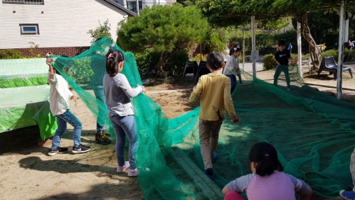 한결어린이집 생태 모래 놀이터 놀이前 모래놀이터의 그물망을 걷어냅니다!