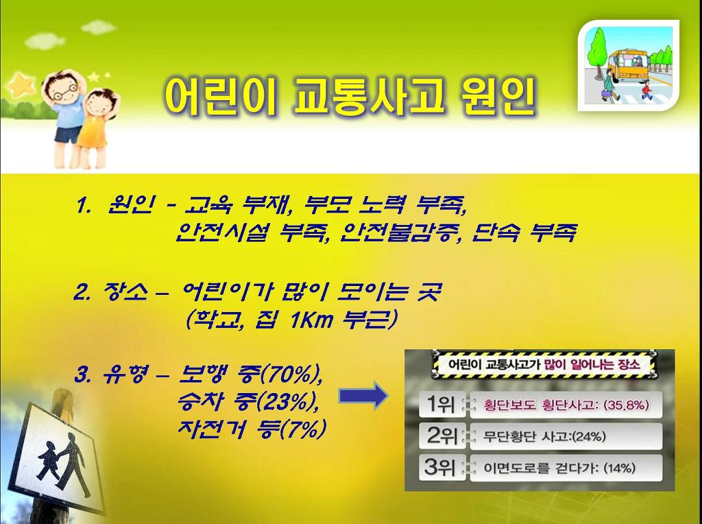 가까운 일본부터 영국, 프랑스, 독일 같은 선진국도 어린이 교통안전교육을 법적으로 의무화하여 시행하고 있다.