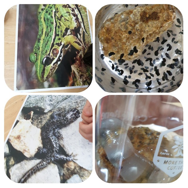 개구리알과 도롱뇽 알을 숲에서 가져와 교실에서 탐색합니다.