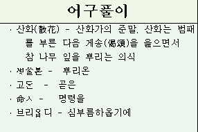 < 배경 설화 > : 이 노래는 유사 권 5 월명사 도솔가조에 실려 있다. 경덕왕 19년 병자 4월 초하루에 두 개의 해가 나타나서 10일이 되도록 없어지지 않았다. 일관이 아뢰기를 "인연이 있는 스님을 청하여 散花功德을 지으면 재앙을 물리치리이다."라고 하였다. 그래서 제단을 조원선에 깨끗이 꾸며 놓고 임금이 창양루에 나가 앉아서 인연이 있는 스님이 지나가기를 기다렸다. 마침 월명사가 언덕 남쪽 길로 가고 있었다. 임금이 그를 부르라 하여 제단을 열고 의식을 시작하게 하니, 월명사가 아뢰기를 저는 다만 화랑의 무리에 속하여 있기 때문에 오직 향가만 알 뿐이고 범패노래(讀經)는 아직 못합니다 했다. 임금이 말하기를 이미 인연 있는 스님이 되었으니 향가를 쓰더라도 무방하다고 하였다. 월명사는 이 말을 듣고 도솔가를 지어 불렀다.
